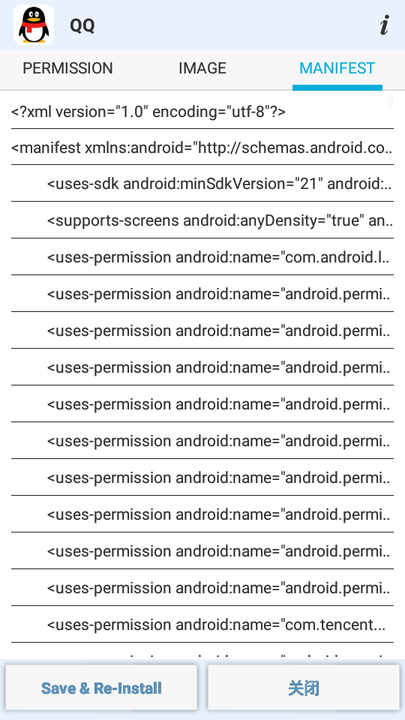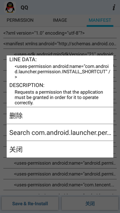 在主屏幕点击 "打开APK文件" , 然后选择需修改权限的apk程序, 稍候将显示apk程序的所有权限. 勾选要删除的权限然后点击 "移除 & 安装" 按钮. 请注意: 如果你需删除权限的apk程序已安装, 请先卸载然后再安装删除权限的apk程序.
