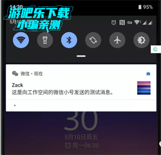 5、个人和工作空间的相同应用可以分别在主页桌面上生成图标,所以有不一样的区分,并且工作空间的应用前缀也可以加上不同符号,它们的通知渠道是相互独立的,你也可以为两个微信设定不一样的推送声音,但推送到的消息显示则是一样的,唯独会在右边显示一个蓝色公文包 logo。