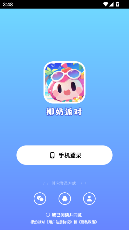 下载进入椰奶派对软件,这里可以使用手机号或者微信、qq进行登录