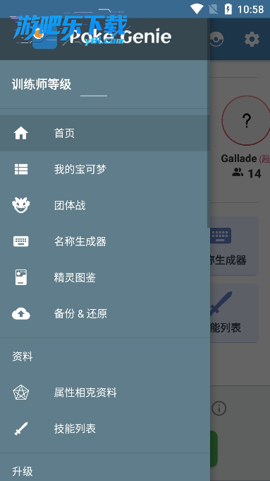 4、点击左上角的菜单栏,可以找到团体站、属性相克资料等工具。