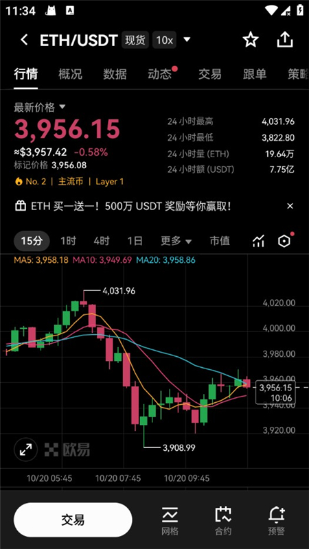 1、进入欧易APP主界面,在首页中点击页面下方【交易】- 选择现货