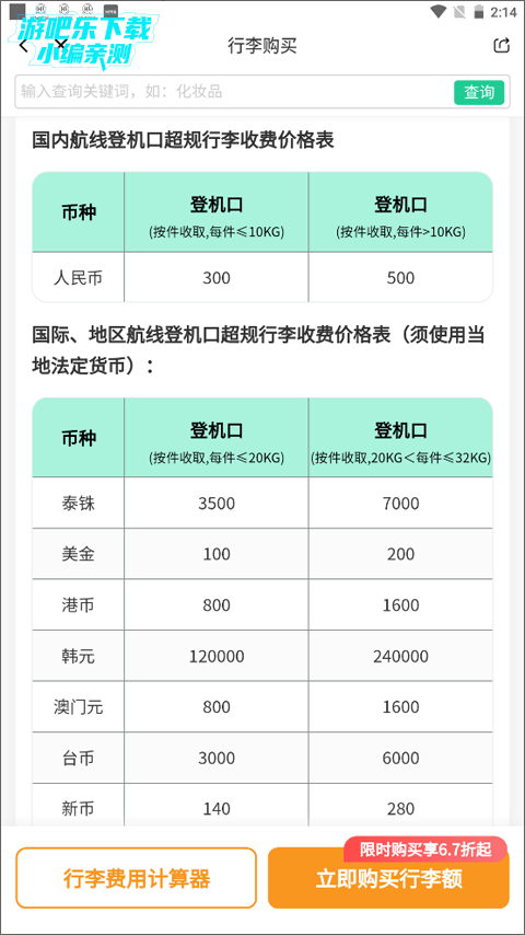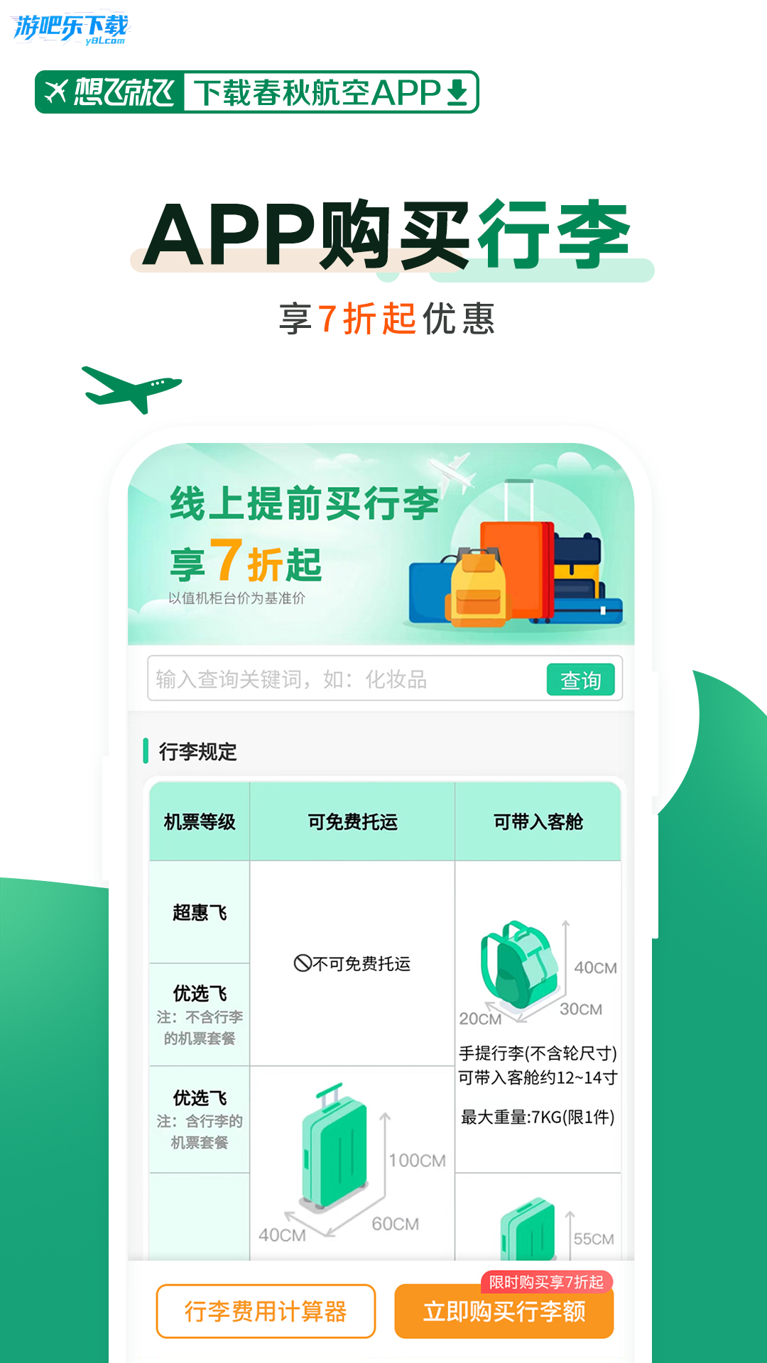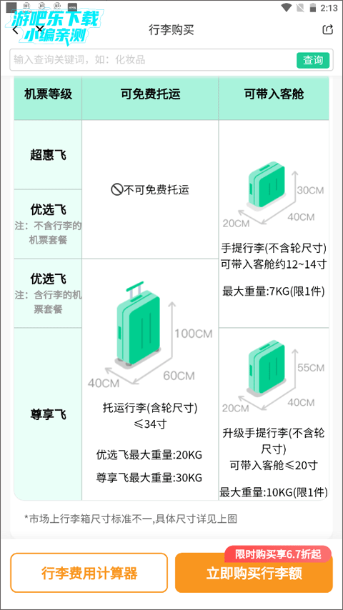 【行李优惠】APP线上行李购买价为现场购买价的7折起。