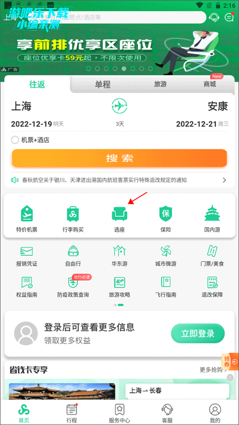 1、打开春秋航空手机app并进入到【首页】,上面显示了很多的功能:特价机票、行李购买、选座、保险等功能,点击“选座”。