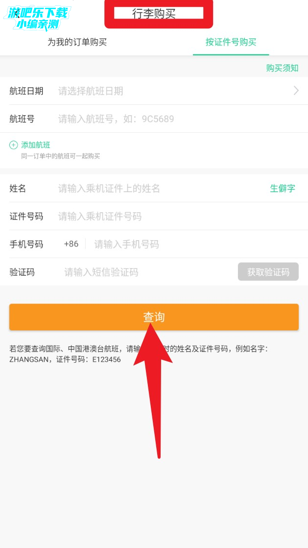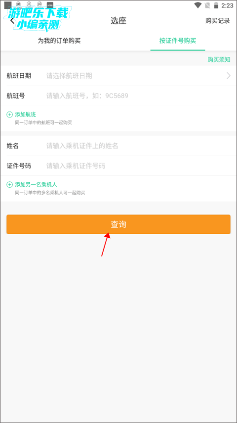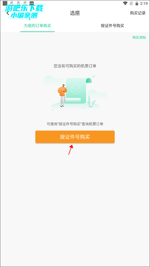 2、这时你还没有购买的机票订单,所以如果想选座的话可以按证件号查询机票订单,点击“按证件号购买”。
