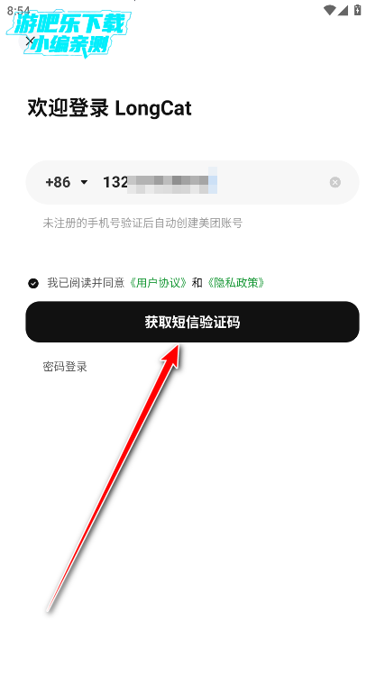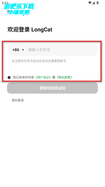 1、打开LongCat,输入手机号,勾选我已阅读并同意《用户协议》和《隐私政策》,这里需要注意的是未注册的手机号验证后自动创建美团账号。