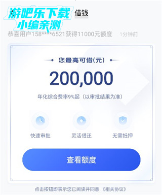 2、然后大家点击进入可以看到借钱查看额度,大家登录之后同意协议就可以借钱了。
