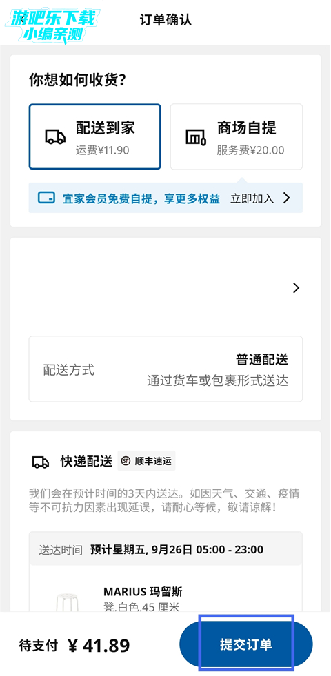若选择配送到家方式,添加地址,点击【提交订单】进行付款即可。