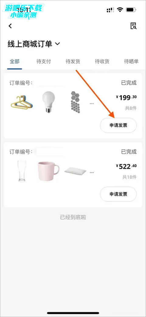 2、来到订单界面,点击订单右下方的“申请开票”
