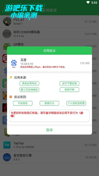 3、点击应用投诉,可以查看手机上安装的各类应用,点击后选择投诉原因和描述,提交即可