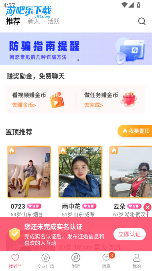 - 平台在安全方面做得挺让人放心的。注册时需要验证,而且我看资料审核也比较严格,减少了很多不必要的骚扰。这里推荐的人也比较符合我的条件,不是随便乱推的,能感觉到是专门为我们中老年人设计的,很贴心。