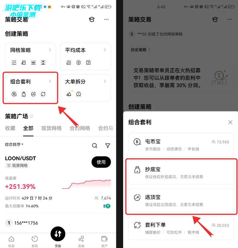 1)打开OKX App,点击【交易】,选择【策略】,在【组合套利】里选择【抄底宝】/【逃顶宝】