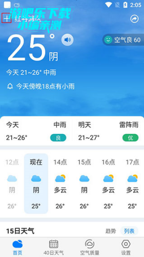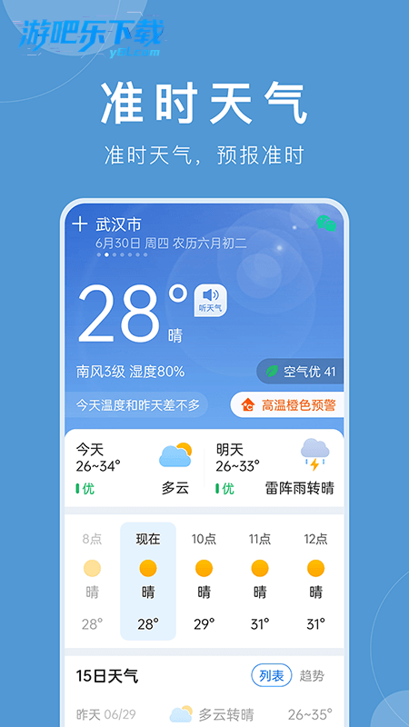 准时天气预报app实时分析云图实现分钟级天气预报,精准预判雨停时间;支持公里级、逐小时天气预报,云量、能见度等数据细化至每小时,满足深度需求。整合全球 20 多个数据源,精准推送 40 日长期预报与 15 日短期预报,今天、明天天气更经人工复核,误差率显著降低。