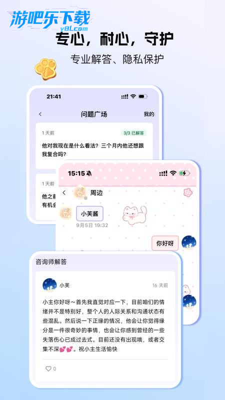 - 卜叽的占卜功能挺有趣的,可以当作日常解压的小工具。问题广场的内容比较丰富,可以看看别人的故事,也分享自己的经历。总体来说,是一款不错的心理治愈软件。