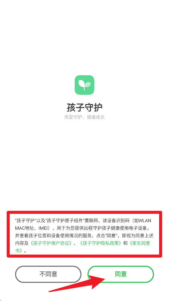 1、首次打开“孩子守护”,阅读并同意《用户协议》《隐私政策》和《家长同意书》,点击“同意”进入。