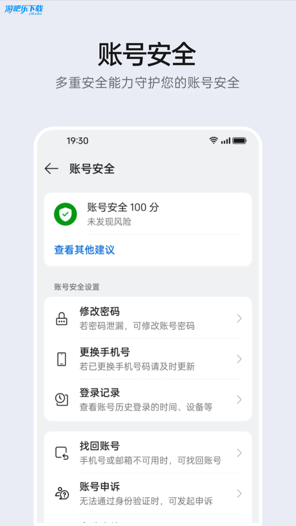 ① 查看风险评分:【账号中心】→【安全中心】→【风险检测】,系统根据设备 / 网络环境生成评分(≥80 分为安全);