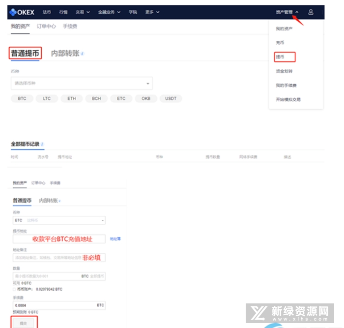 2.点击页面右上方资产管理,选择提币,可以选择普通提币或内部转账,选择想要提币的币种后进入提币界面,输入提币地址和提币数量,点击提交。