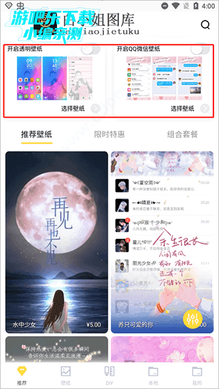 其中为用户们提供了”透明壁纸”和“QQ微信壁纸”两个选择,透明壁纸:在所有应用显示壁纸,QQ微信壁纸:仅在微信、QQ显示透明壁纸