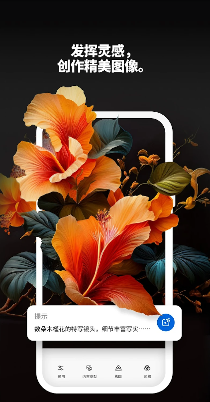 adobefirefly中文版全新功能强大的手机AI图片生成应用工具平台,为用户精心打造的创意设计以及视觉内容涉及需求相结合,无论是照片,还是艺术创作都可以用AI找感觉,有需求的朋友快来下载体验一番吧!