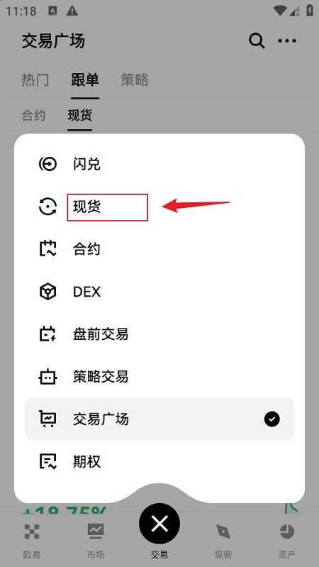 1、进入欧易APP主界面,在首页中点击页面下方【交易】- 选择现货