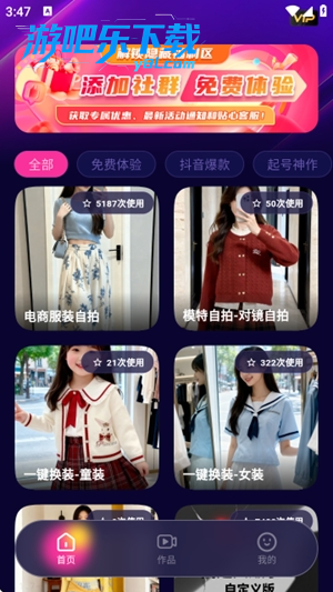 2:进入APP首页,可浏览“电商服装自拍”“模特自拍-对镜自拍”“一键换装-童装”“一键换装-女装”等各类视频创作模板,根据需求选择模板开始创作。