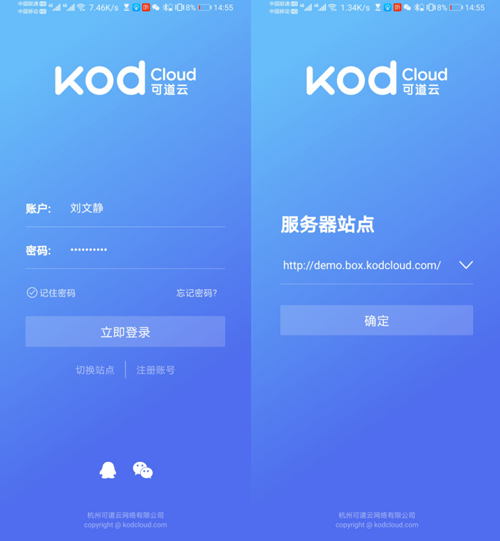 输入站点信息:由于可道云KODBOX是私有云软件,不同系统的服务器地址可能有所不同。首次登录时,需要在登录页点击【切换站点】进入服务器站点设置页,然后填入正确的服务器地址。这一地址通常需要联系管理员获取。