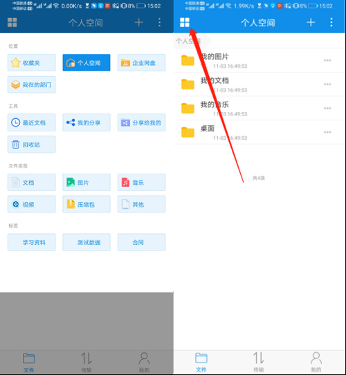 通过左上角的按钮,可以找到其他文件快捷入口,如【收藏夹】、【个人网盘】、【企业网盘】、【部门网盘】等,方便用户进入不同目录对文件进行管理。