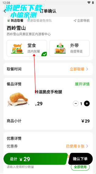 3、在订单确认界面里,选择堂食,然后点击确认下单就可以点餐了。