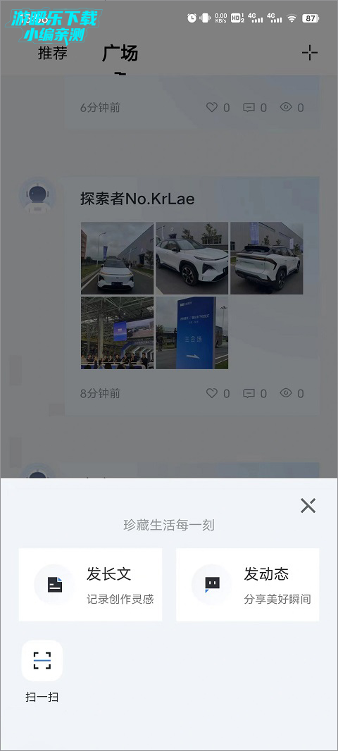 2、在“探索”选项中可以查看品牌动态,“广场”中可以发长文、发动态。
