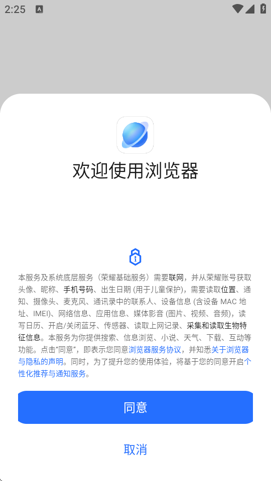 1、新用户首次进入荣耀浏览器,会提示获取权限之类,点击同意即可;
