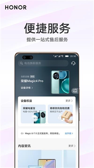 我的荣耀App集品牌资讯、玩机技巧、售后服务、会员权益于一体。亮点包括7*24小时在线客服、便捷服务中心查询、智能设备检测等贴心服务。新增俱乐部校园/同城栏目,优化内容推荐,更有视频维修指引,省心安心。