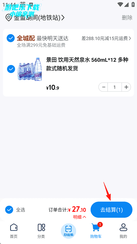 6、点击“购物车”确认购买商品,再点击“去结算”。