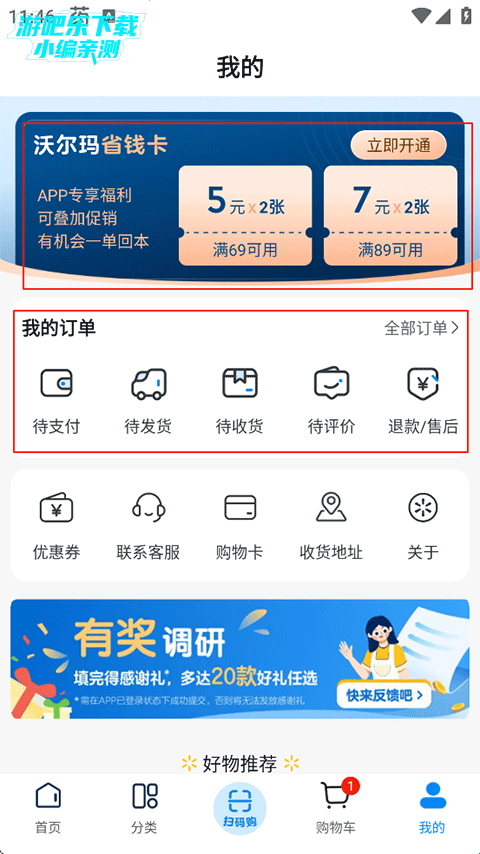 9、最后在“我的”-“我的订单”中可以查看您购买的商品订单,上方提供了沃尔玛省钱卡,开通后购物更划算哦。