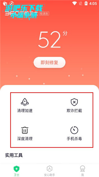 360手机卫士极速版安卓版是一款轻量化手机安全管理工具。相比普通版,它主打内存占用小、界面极简且无广告的特点,核心聚焦手机清理、安全防护等实用功能。操作简单,快来下载使用吧!