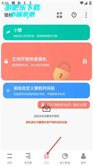 3、锁机板块有小憩、快速锁机、自定义锁机时间段功能,是比学霸模式更严格的自控工具,帮助减少手机干扰。