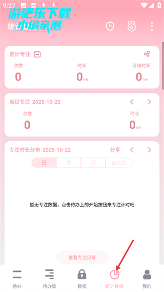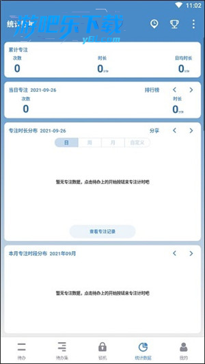 4、统计数据板块可查看累计专注、当日专注及专注时长分布,助力用户了解专注情况,合理规划时间,还能查看专注记录。