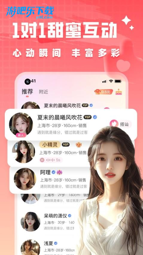 附近陌约会交友软件官方版是一款同城陌生人交友软件。是为单身用户搭建近距离交友桥梁,主打同城快速匹配与多元互动。支持1000米内精准定位,能帮助用户快速连接附近的单身人士或兴趣相投的对象哦!