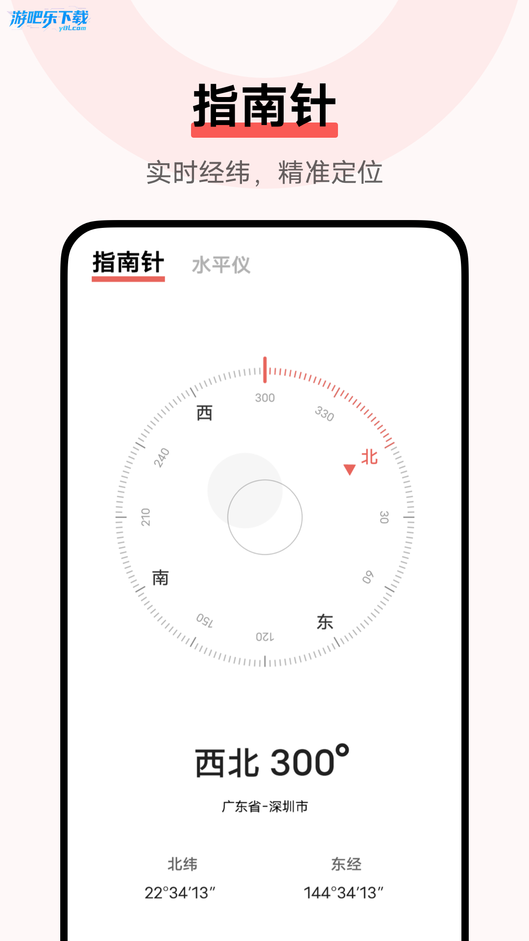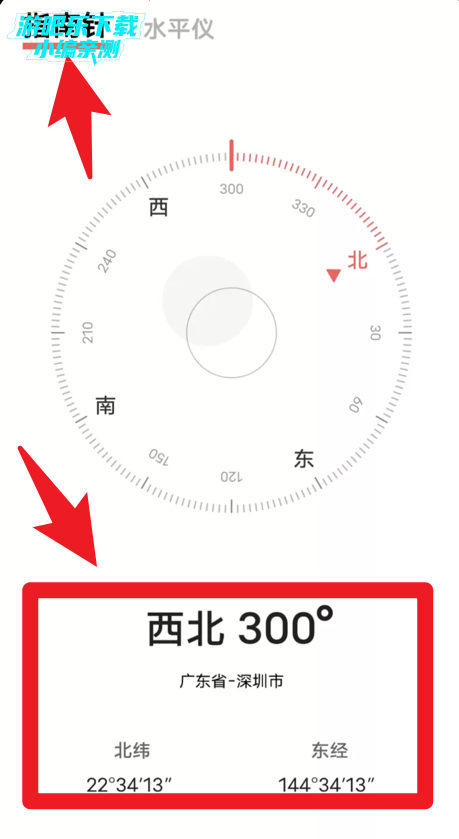 2、在指南针功能界面,可以直观查看当前所处方位与角度,同时显示详细的经纬度及所在城市。