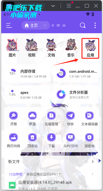 想要将软件设置成默认安装软件,需要打开一些权限,可以利用es管理器,选择应用,然后打开软件
