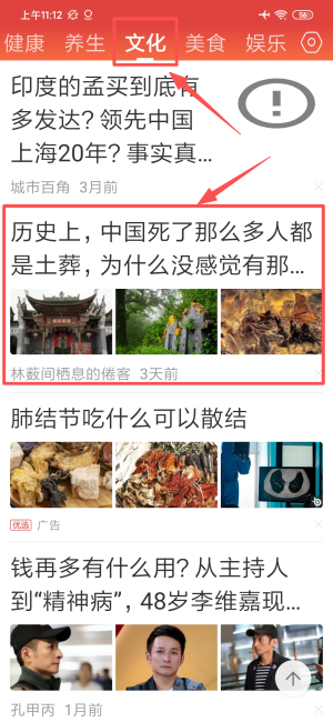 2、于文化分类选取历史类文章,进入内容浏览页面。