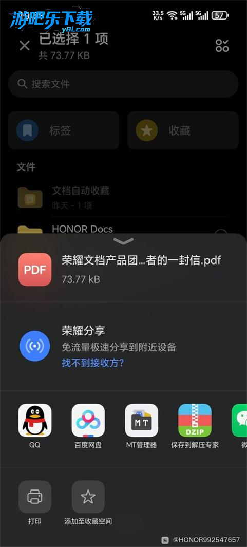 在发送方设备上,长按需要传输的文件(如图片、文档、视频等),点击“分享”按钮,选择“荣耀分享”选项,系统会自动搜索附近已开启功能的设备。