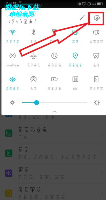 1、首先,在手机主屏幕上往下滑动,在弹出的窗口中点击右上角的设置的图标。