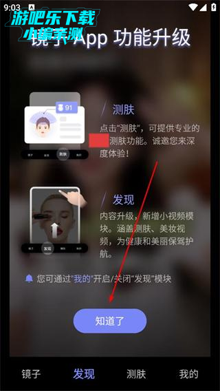 1、打开软件查看功能升级提示,了解测肤功能可提供专业测肤,发现板块新增小视频模块涵盖护肤美妆内容,点击知道了关闭提示进入主界面。