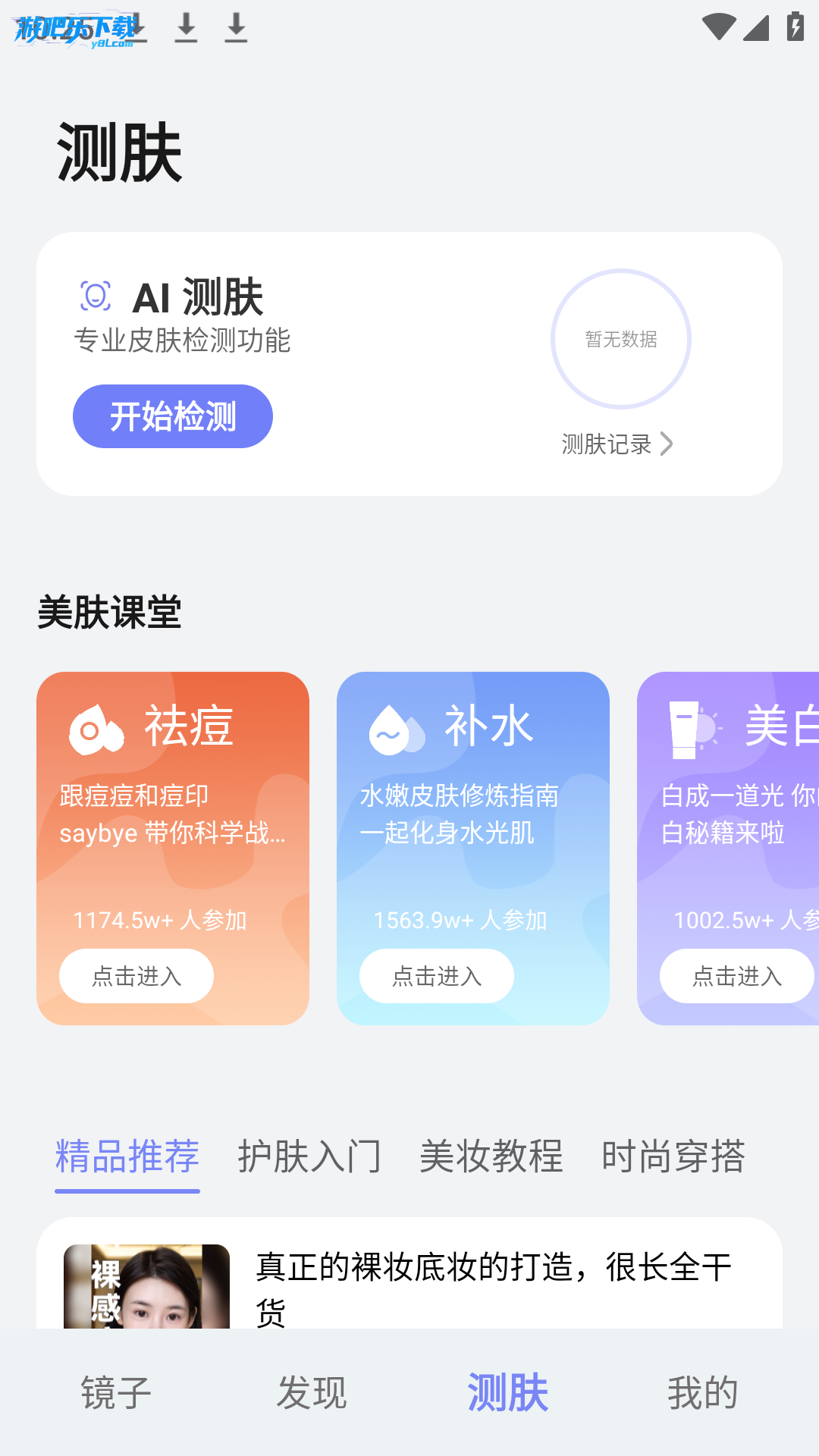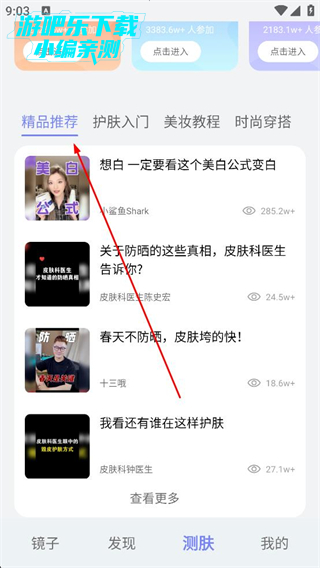 3、进入测肤板块查看精品推荐内容,选择护肤入门美妆教程等分类,浏览美白防晒护肤相关文章,点击感兴趣的内容进入详情页了解具体信息。