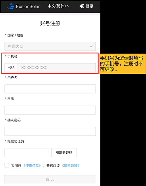 - 如果您所在的地区不支持自助注册账号,需要安装商为您创建账号并绑定电站,账号创建后,系统会将账号以及初始密码以短信形式通知您。
