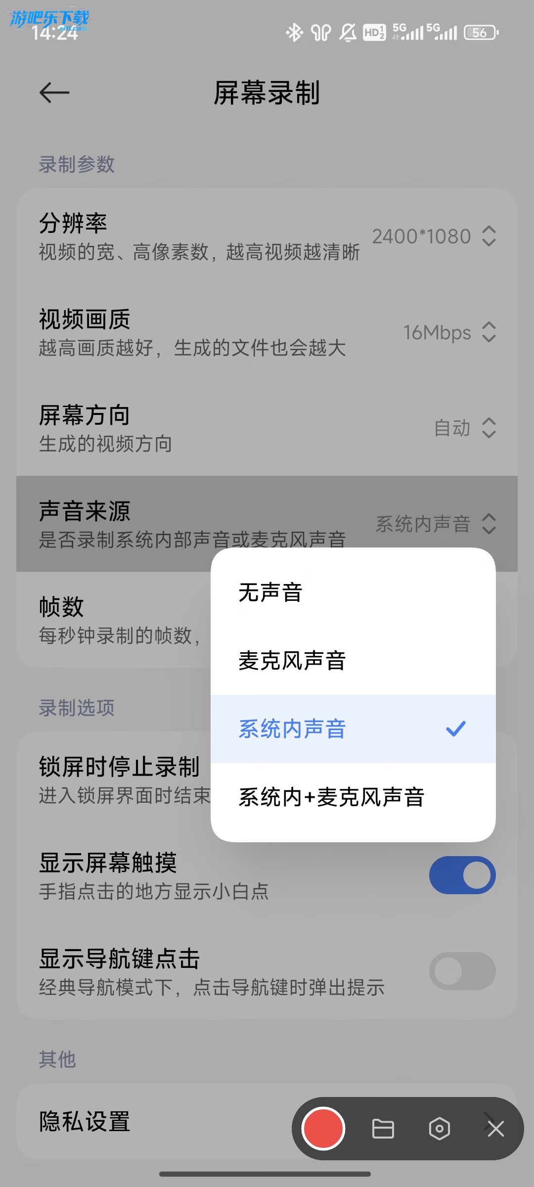 进入 “设置 - 显示 - 屏幕录制”,可调整录制分辨率(720P/1080P)、帧率(30 帧 / 60 帧)、声音来源;