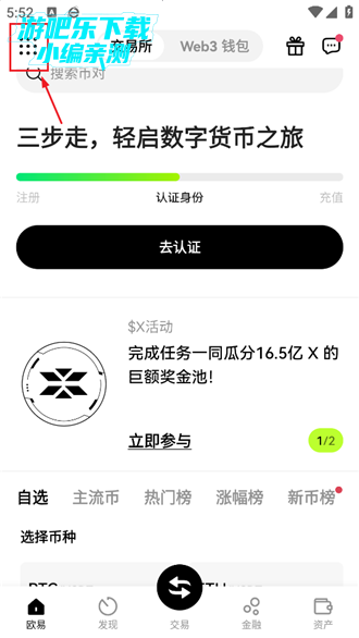 1, 打开o易交易所app,点击右上角的画圈的地方;