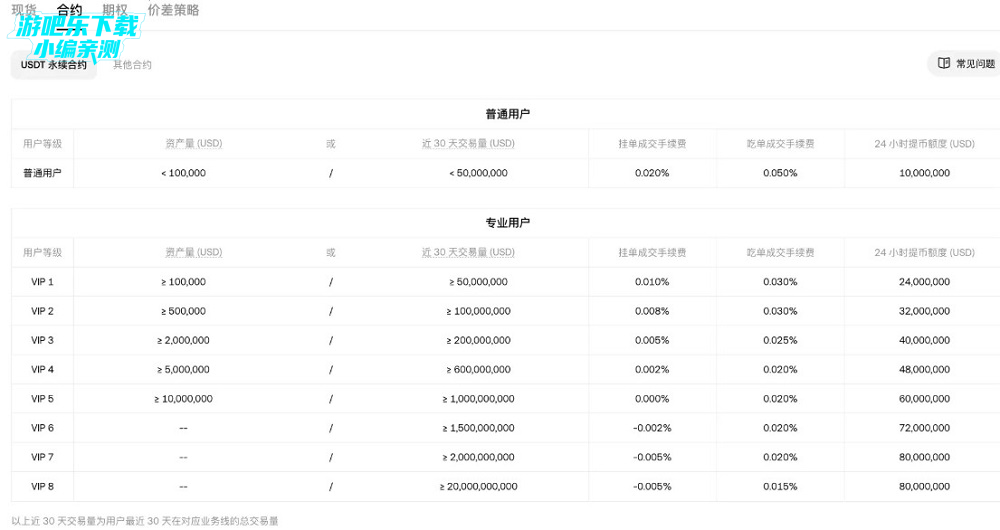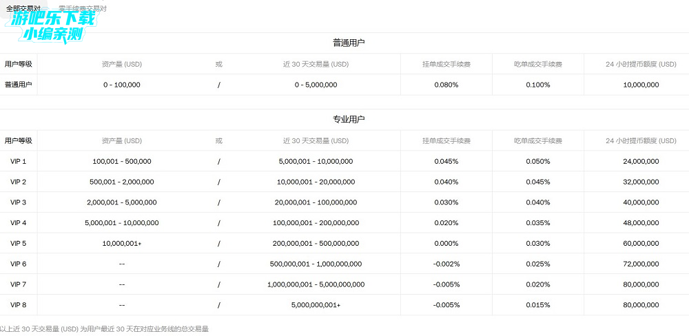 不同的等级决定了接下来一天的交易手续费率。根据交易量的不同,用户分为普通和专业两种等级。专业用户根据资产量和近 30 天交易量进行等级划分,不同等级享有不同的交易手续费,参考