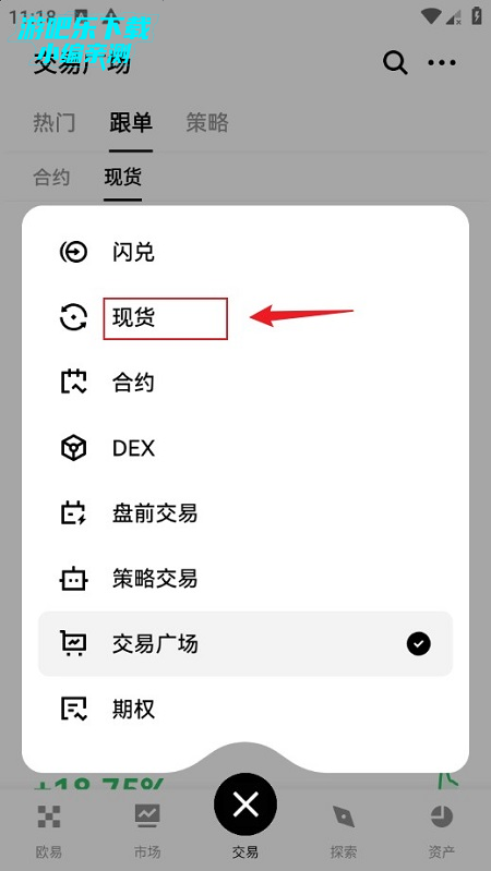1、进入欧易APP主界面,在首页中点击页面下方【交易】- 选择现货