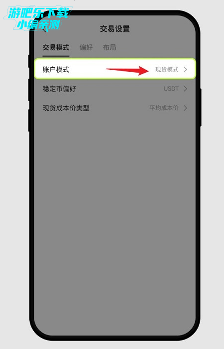 3、进入交易设置界面后,在账户模式这里改成现货模式(默认为合约模式)