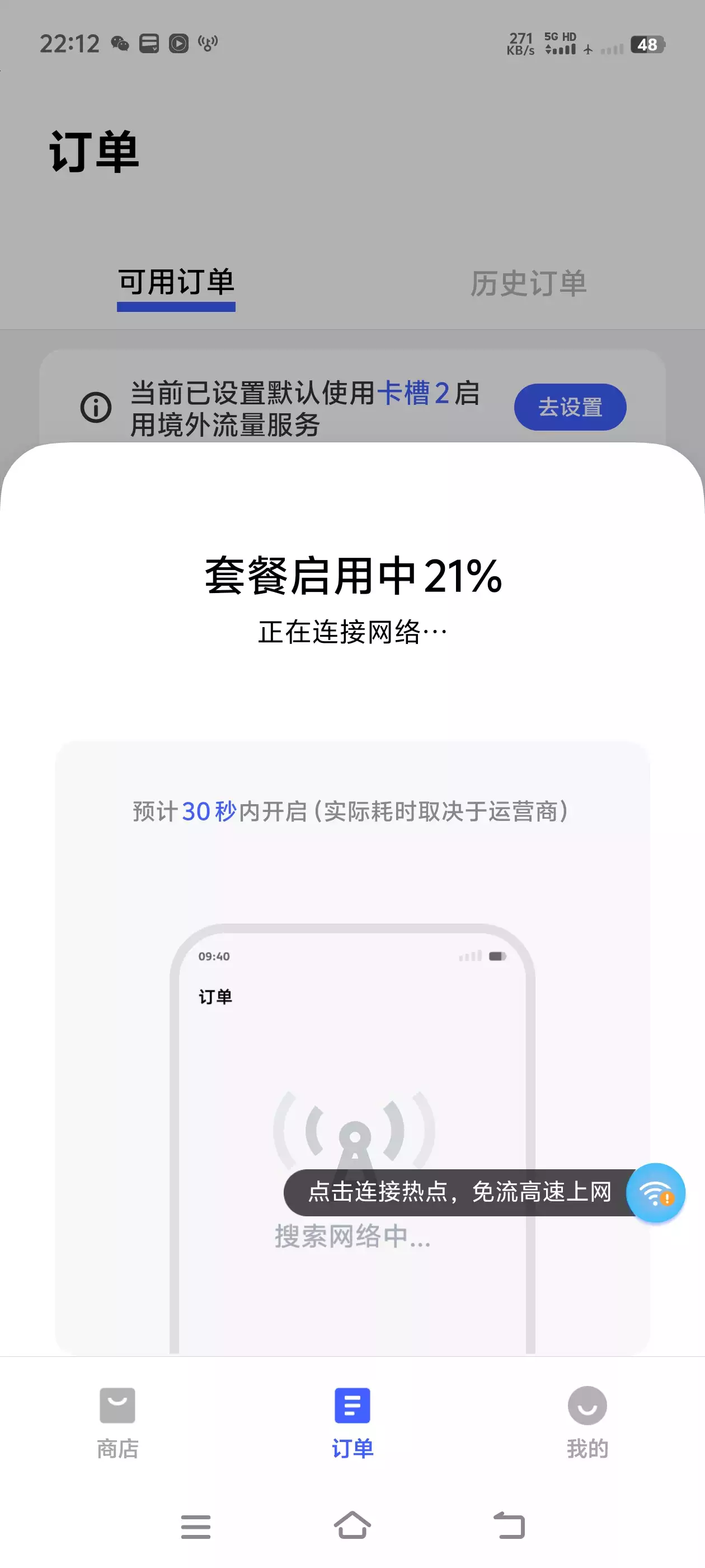 (注:如果您的手机有两张SIM卡,则会提示您需要占用的卡槽,被占用卡槽的实体SIM卡将暂时停止通讯服务,无法接听拨打和收发短信,暂停境外流量后即可恢复)